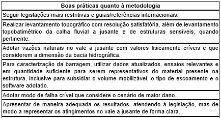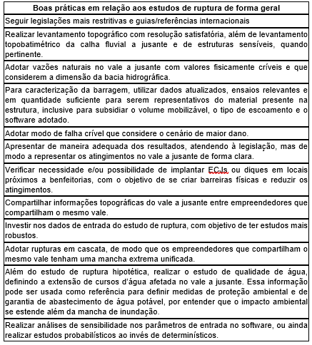 Algumas das principais etapas que compõem o estudo e são detalhadas no Guia são: levantamento topográfico, estudo hidrológico em relação à definição da vazão no vale a jusante, barragens a jusante e ruptura em cascata, caracterização geotécnica e reológica do material, volume mobilizado, modo de falha, propagação do hidrograma de ruptura no vale a jusante e softwares, utilizados para a apresentação dos resultados. A Tabela 3, a seguir, apresenta as boas práticas dos estudos de ruptura hipotética no que concerne à metodologia.