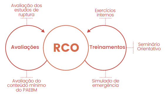 Uma das normativas de maior destaque em termos de implementação e operacionalização de PAE é a Resolução ANM nº 95/2022 que estabeleceu a Avaliação de Conformidade e Operacionalidade que se concretiza com a publicação do Relatório de Conformidade e Operacionalidade (RCO), que avalia os estudos elaborados em relação à conformidade com a exigência de conteúdo mínimo da legislação e a aplicação de treinamentos regulares, seminários com a população e a realização de simulados de emergência, conforme sintetiza a Figura 1 a seguir.