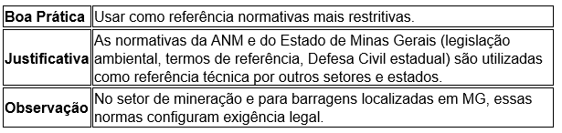 Em 2023, a ANM alterou a Resolução ANM nº 95/2022 por meio da Resolução ANM nº 130/2023 e mais recentemente pela Resolução nº ANM 175/2024. A Tabela 1 mostra as Boas Práticas apontadas sob o aspecto da Perspectiva Legal que podem ser implementadas.