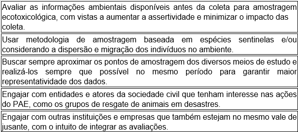 O aumento da pressão social e institucional sobre a segurança de barragens contribuiu para a ampliação do escopo ambiental dos Planos de Ação de Emergência (PAE), os quais passaram a ser considerados também como instrumentos de desenvolvimento de resiliência nas bacias hidrográficas (World Bank, 2017). Atualmente, os estudos ambientais associados ao PAE envolvem, por exemplo, a definição das áreas potencialmente inundáveis com base em cenários de ruptura hipotética e a caracterização da biodiversidade afetada. Contudo, permanece crítica à ausência de critérios técnicos claros para coleta, análise e monitoramento da fauna, o que pode acarretar impactos adicionais durante a elaboração dos estudos.