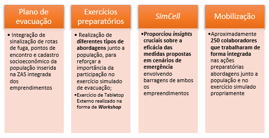 Diante destes exercícios preparatórios, o exercício simulado de evacuação ocorreu em 2024, de forma integrada e inédita entre os empreendedores. Assim, o plano de evacuação foi elaborado de forma conjunta, considerando de rompimento e/ou colapso de barragem, em conformidade com o Lei N° 12.334 de 2010, com os direcionamentos da Resolução GMG-CEDEC 83 de 2024 e do Caderno de Orientações para Apoio à Elaboração de Planos de Contingência Municipais para Barragens (2016).