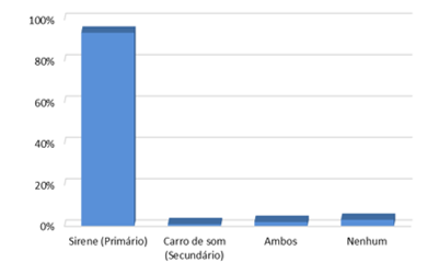 Em relação ao sistema de alerta, conforme apontado pela pesquisa, a grande maioria (96%) respondeu que ouviu o som do sistema de alerta – sirene (primário) (Figura 3), a grande maioria (94%) ouviu a sirene, 1% a sirene móvel (reforço da evacuação preventiva), 2% ambos e nenhum 3% (Figura 4) e a pesquisa indicou que a maioria, (84%) dos participantes considerou o som da sirene eficiente (Figura 5).