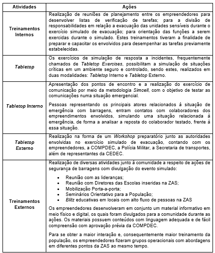 Isto posto, todas as atividades previstas foram realizadas em conjunto. A organização para o simulado contou com a realização de treinamentos que visaram a preparação tanto das equipes de colaboradores internos, dos órgãos de defesa civil, quanto da população potencialmente afetada, que seguiram as ações conforme apresentado no Quadro 2.