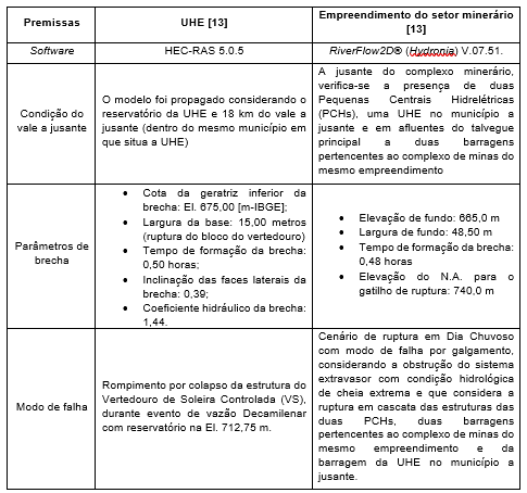 Para o planejamento das ações, considerou-se o pior cenário nos estudos de ruptura hipotética das estruturas envolvidas [1] [4] [11]. O Quadro 1 apresenta as principais premissas adotadas nos estudos de ruptura dos empreendimentos estudados, em que se pode verificar que, de acordo com os resultados dos modelos, não há ruptura em cascata entre a UHE em questão e do empreendimento do setor minerário.