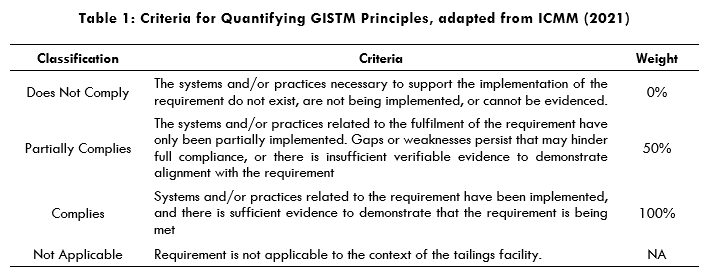A preliminary assessment of the 77 GISTM requirements was then performed to identify those that were effectively applicable to the facility, considering the specific characteristics of the tailings installation. The selected requirements were then evaluated based on their degree of fulfilment, using documentation provided by the operator. Table 1 summarizes the criteria adopted for this evaluation.