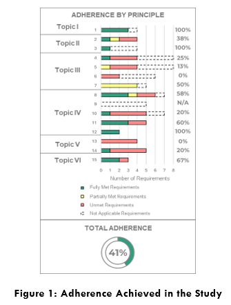 Figure 1 summarizes the average adherence obtained for each of the 15 GISTM principles, as well as the total adherence (41%) based on the collective evaluation of applicable requirements. The legend indicates: green for fully met requirements, yellow for partially met, red for unmet, and dashed lines for those not considered in the assessment.