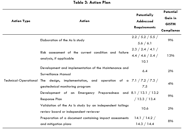 Furthermore, the methodology allowed for the development of a structured action plan, in which each proposed measure is associated with a potential gain in GISTM compliance. This enables the operator not only to visualize the expected impact of each action on overall conformance but also to prioritize initiatives accordingly. As such, the operator has a tool to strategically allocate resources and efforts towards actions that yield the greatest returns in safety, governance, and alignment with GISTM principles.
